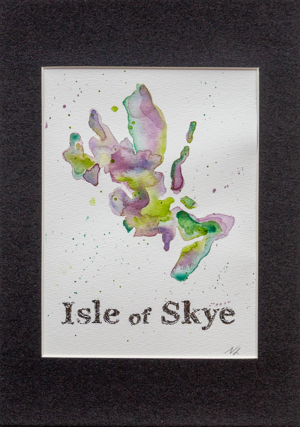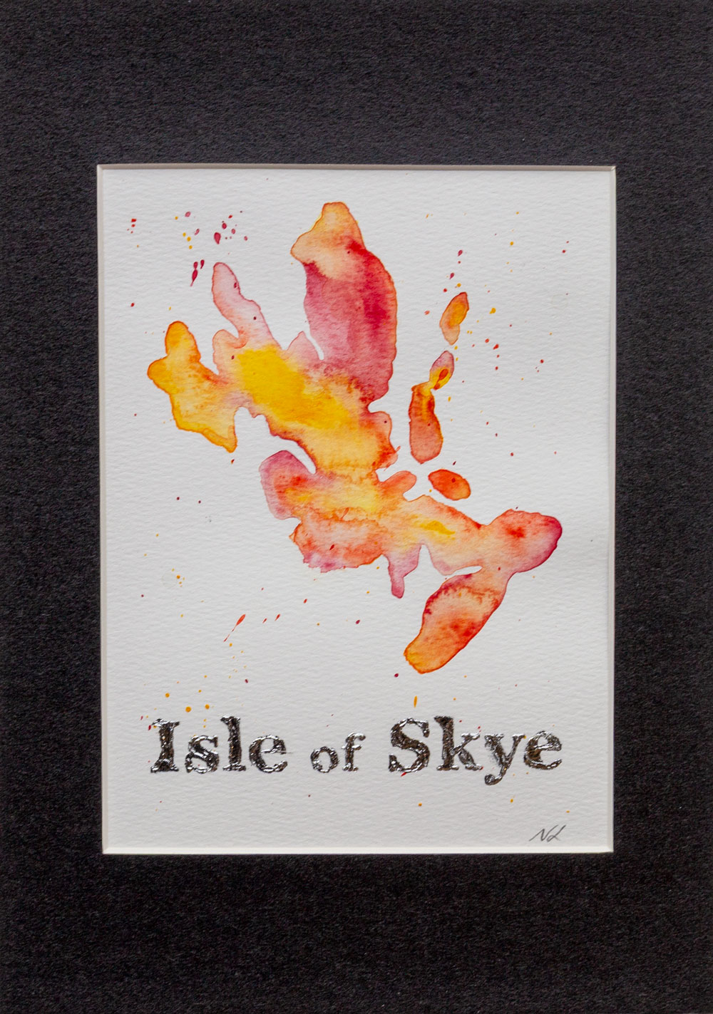 Isle of Skye Watercolour with Silver Leaf. Each piece is a hand-painted watercolour on Skye, delicately enhanced with silver leaf gilding.